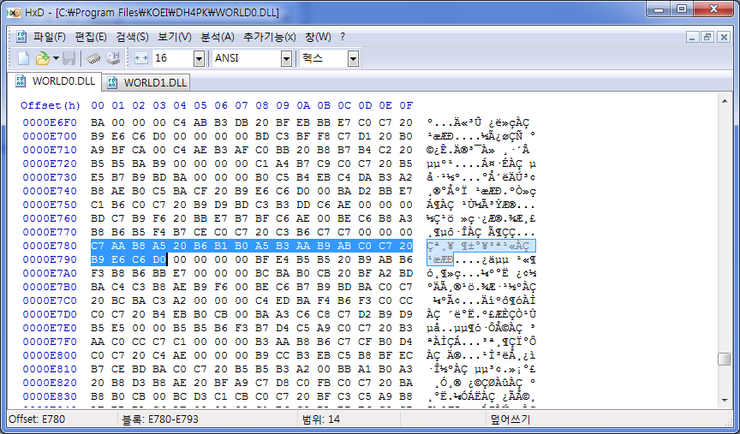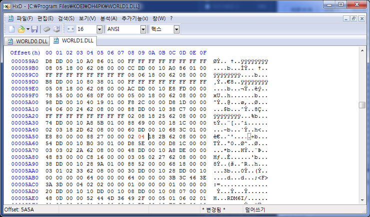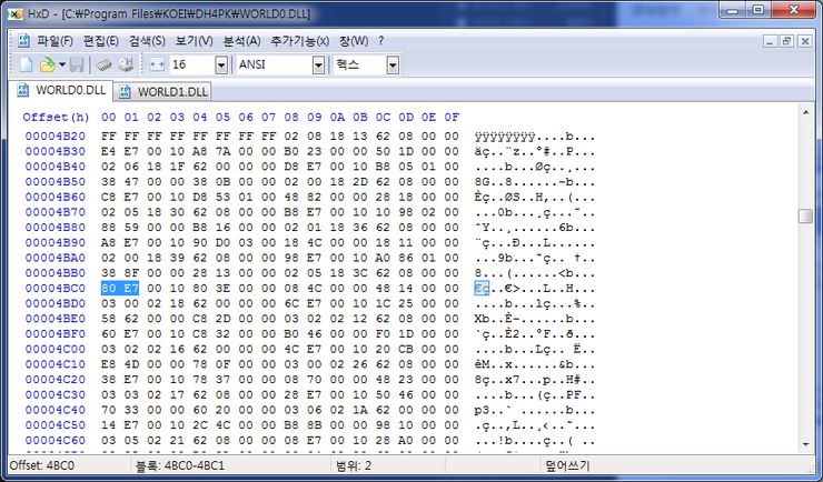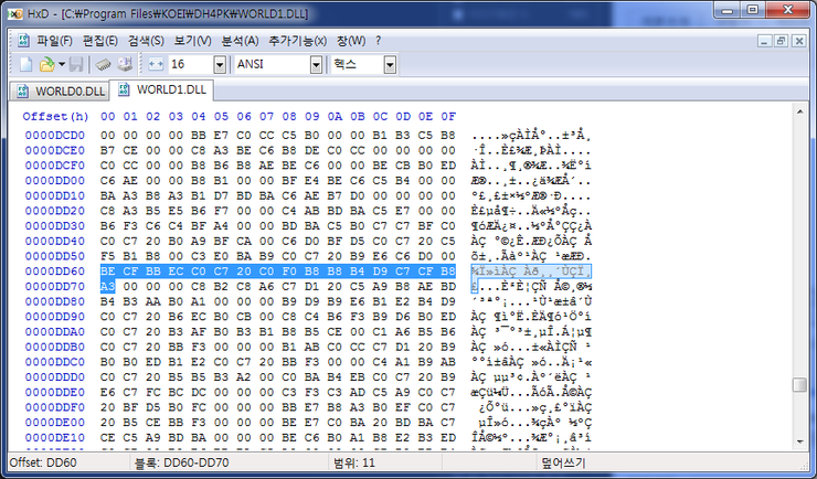 hex edit을 실행하여 world0.dll(구캐릭터 선택시 정보)과 world1.dll(신캐릭터 선택시 정보)를 로드하고