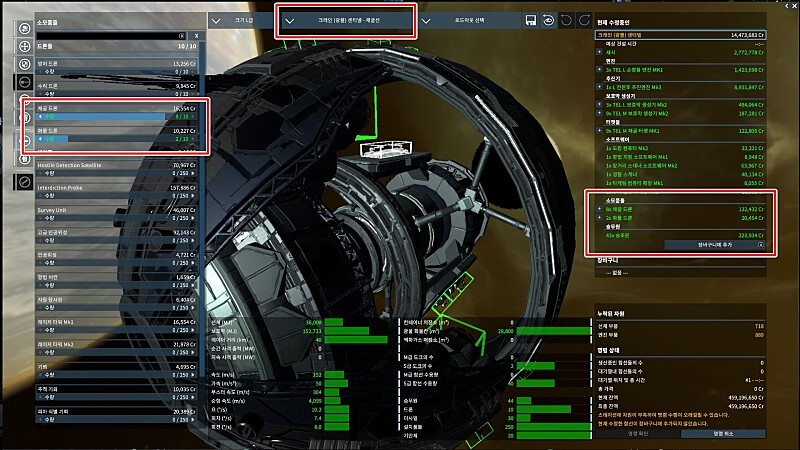 스크린샷에 표시해놓은 대로 채굴드론을 8기, 화물드론을 2기 해놓으면 적당하다.