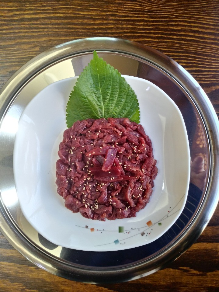 장에 찍어 먹으니, 담백한 육회의 느낌이었어요.