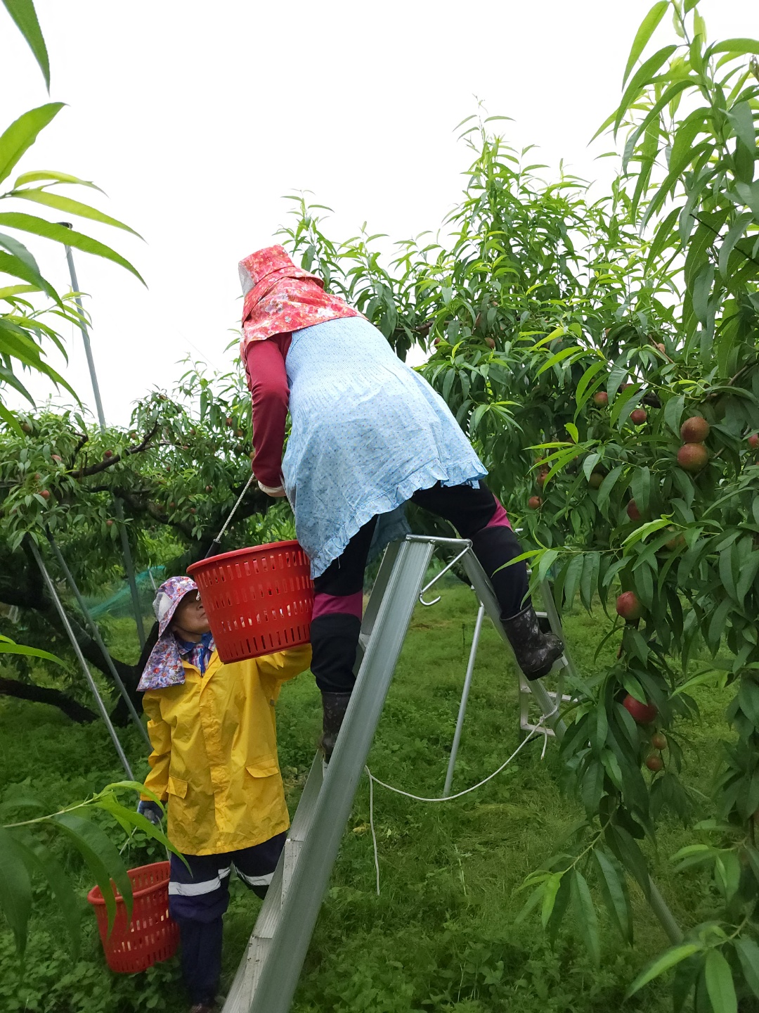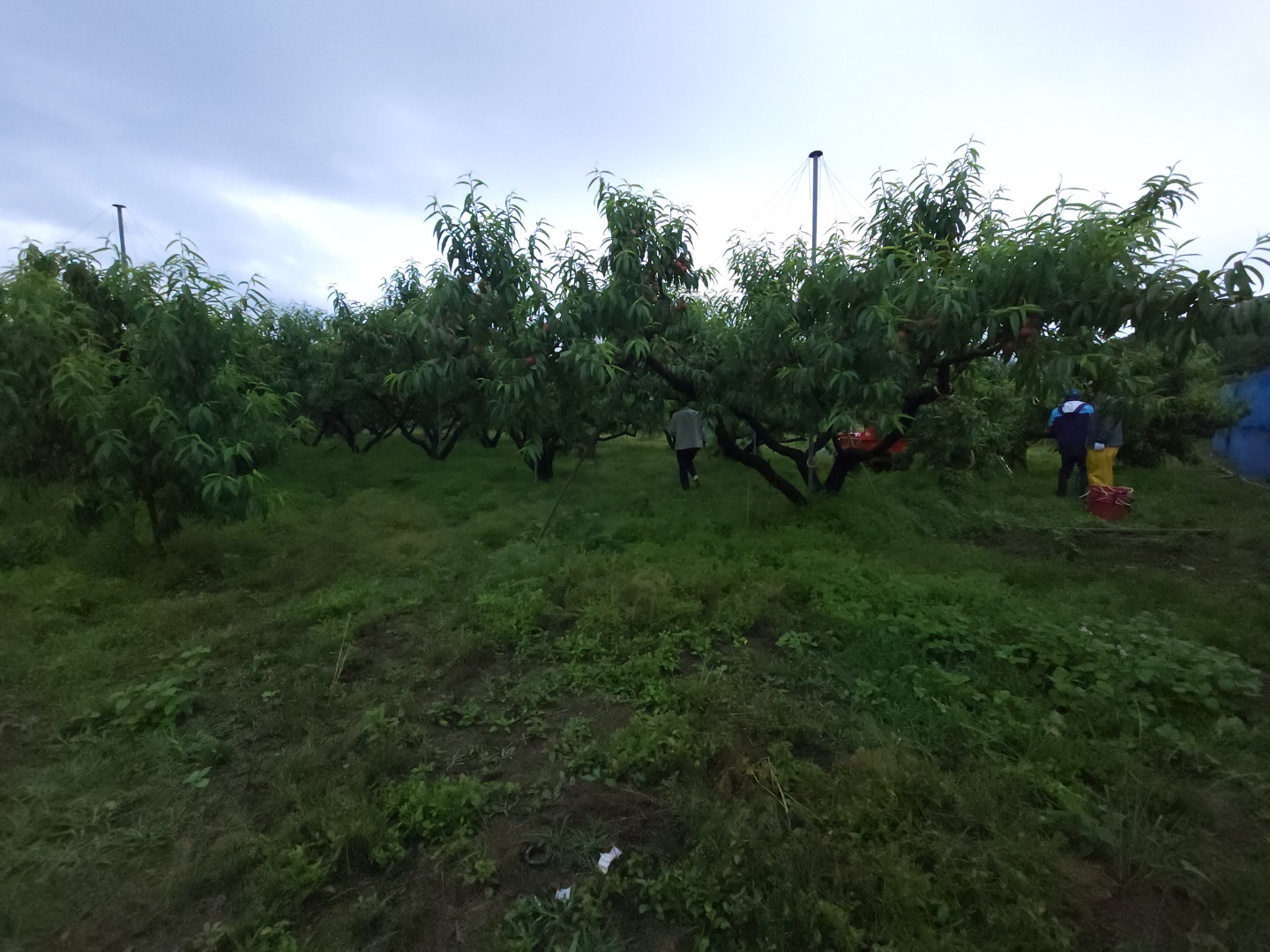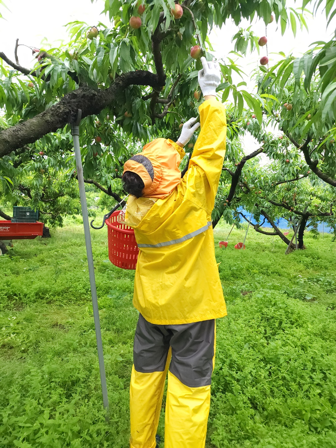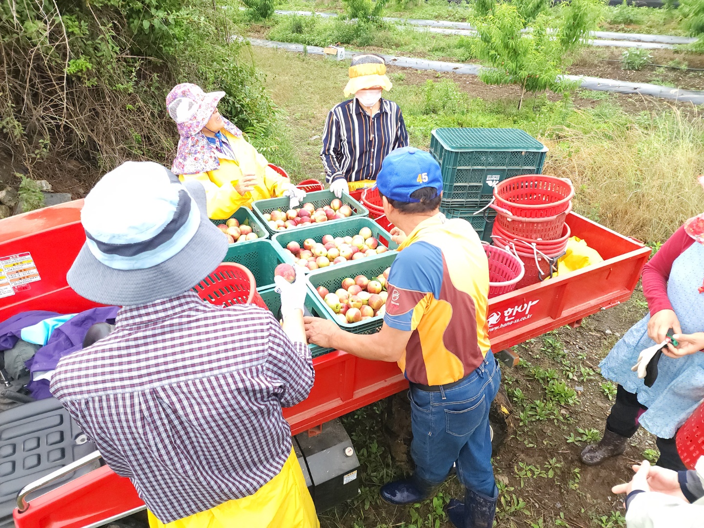 어느정도 수확한 복숭아들을 남으며, 열과를 골라내고 있어요.