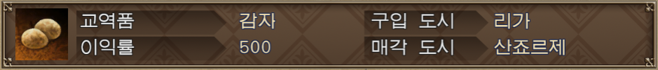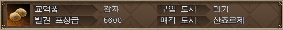 ex1) 감자(식료품)를 팔아 발견 포상금이 5600인 황금항로를 발견했다면, 그 황금항로를 통해