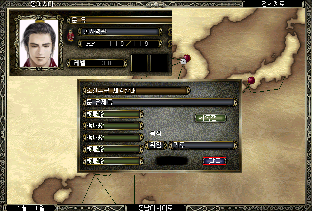 조선의 대표적인 군선인 판옥선(板屋船:무장대형정크) 5척으로 함대 에디트 된...... 조선 수군 제독 문유 (교타로편)